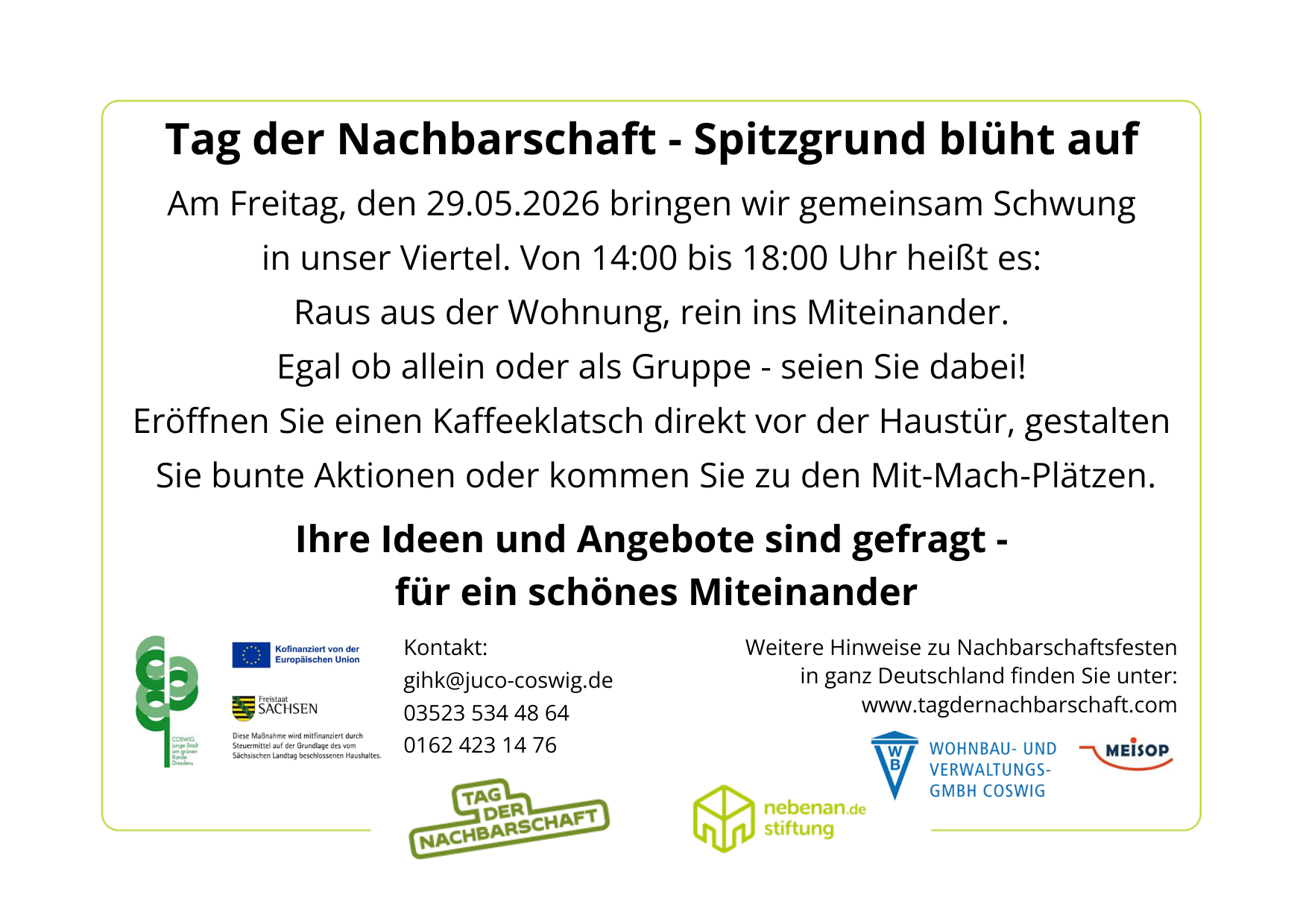 Am Freitag, den 29. Mai 2026 bringen wir gemeinsam Schwung in unser Viertel. Von 14:00 Uhr bis 18:00 Uhr heißt es: Raus aus der Wohnung, rein ins Miteinander. Egal ob allein oder als Gruppe - seien Sie dabei!